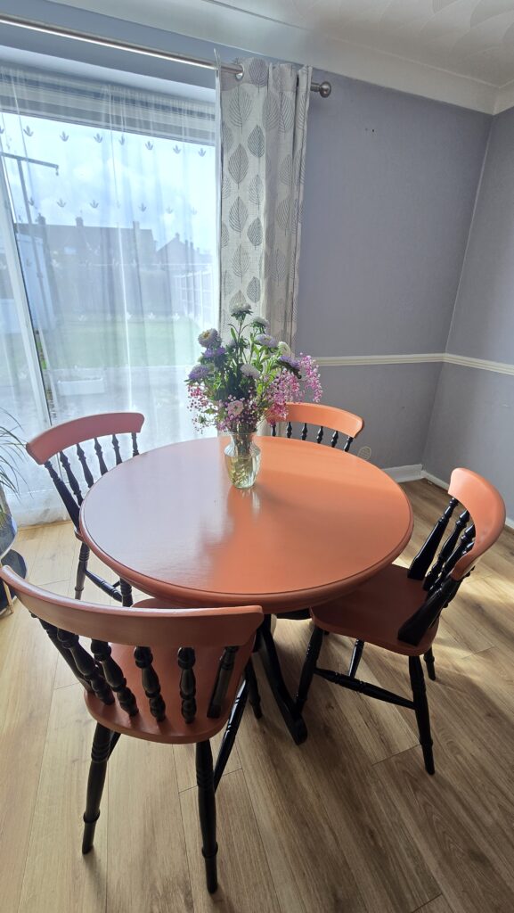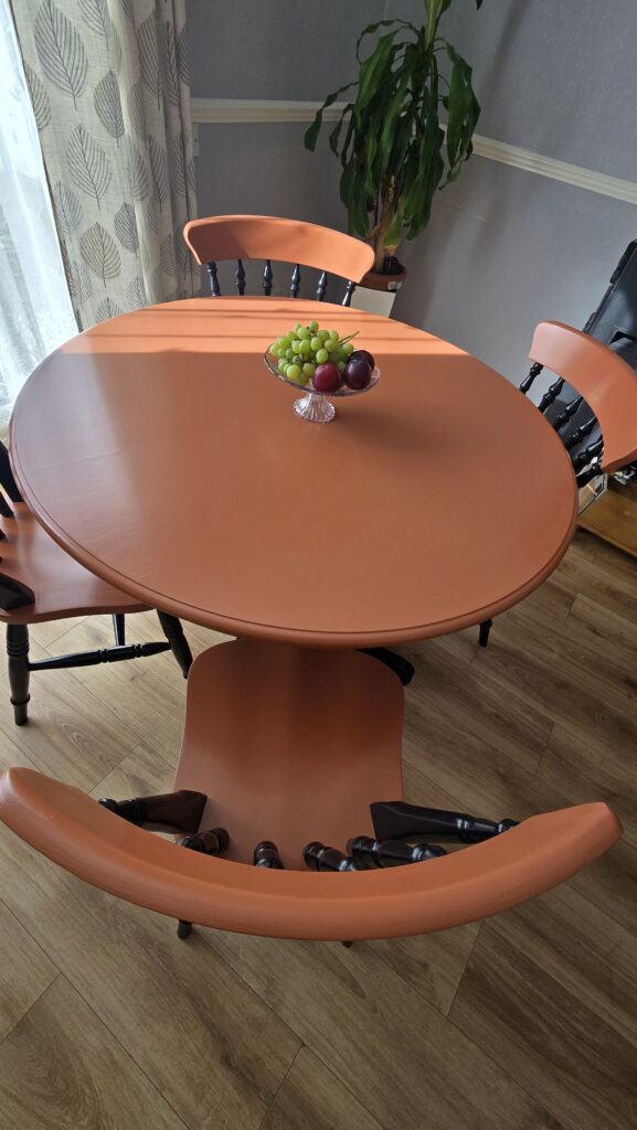 This charming vintage dining set has been lovingly restored and reimagined by hand. The solid wood table and chairs were carefully stripped, sanded, and repaired, then finished with a modern, smooth matte paint that highlights their timeless curves. The chairs have been transformed with a stylish two-tone design, blending classic craftsmanship with a fresh contemporary look.